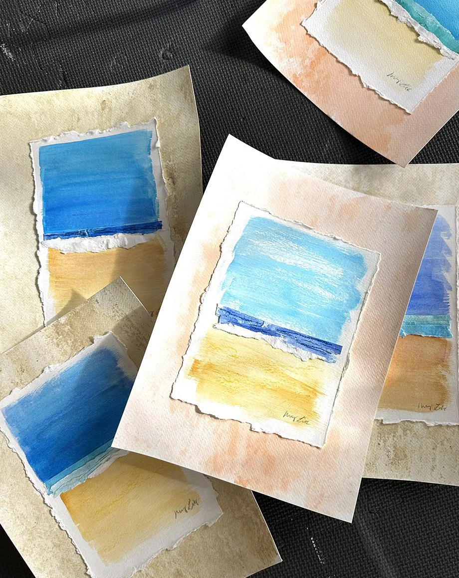 Fleeting moments of perfection are captured in this unique mixed media collection of seascapes. Inspired by the beauty of the ocean, each 9x12" artwork features hand-cut elements mounted on watercolor paper.